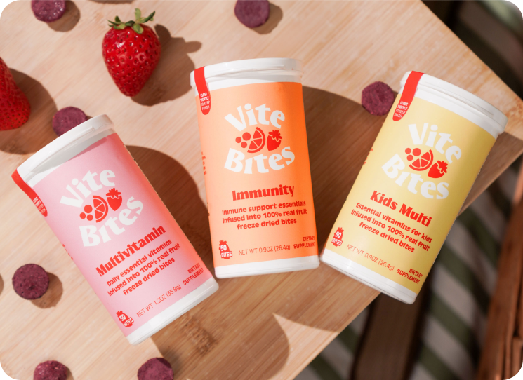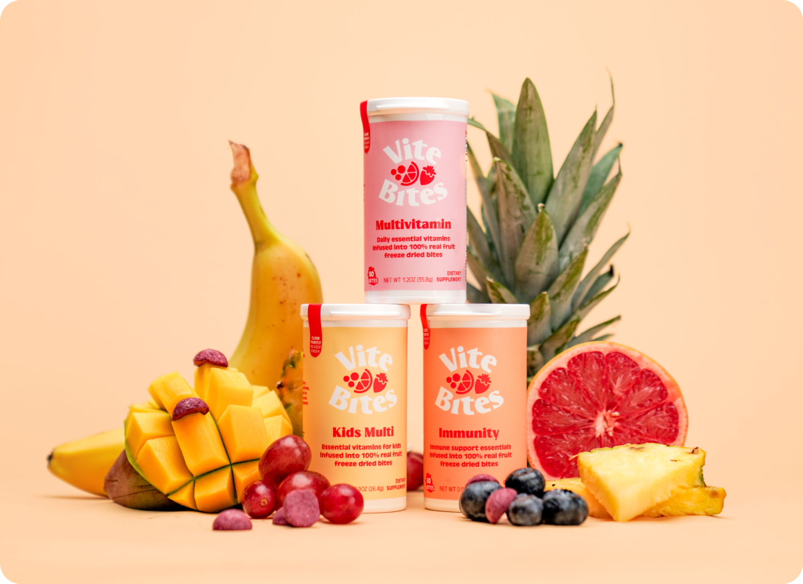 100% Real Fruit, Freeze Dried Vitamin Bites with your daily serving of vitamins and minerals. No fillers, no additives, no hard to pronounce ingredients to support your health, day in and day out!